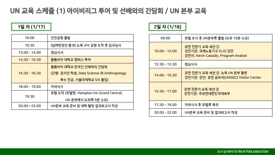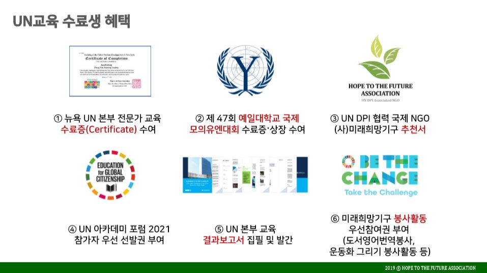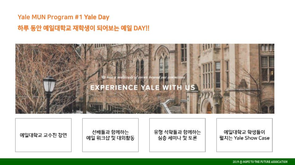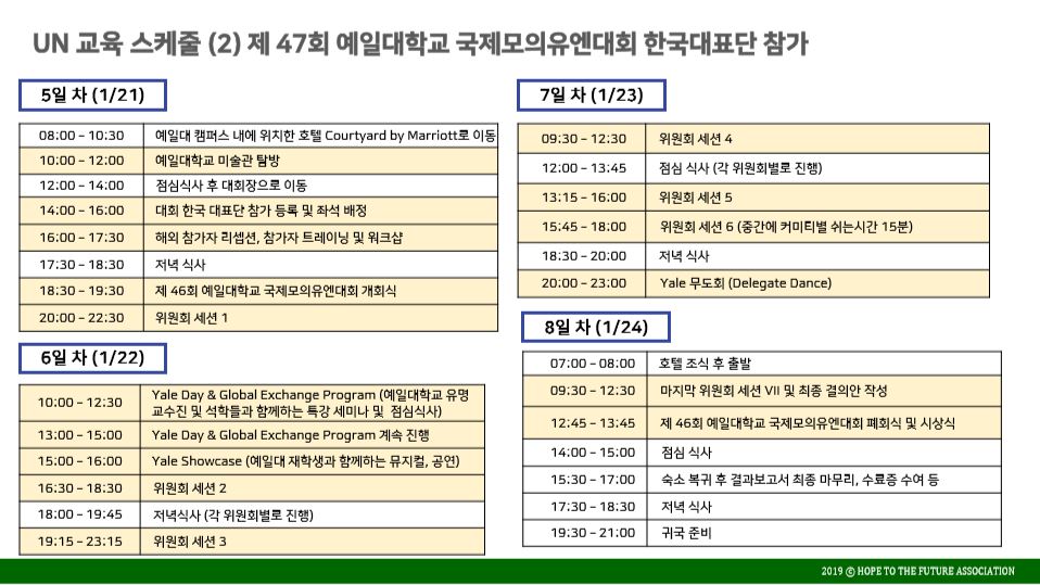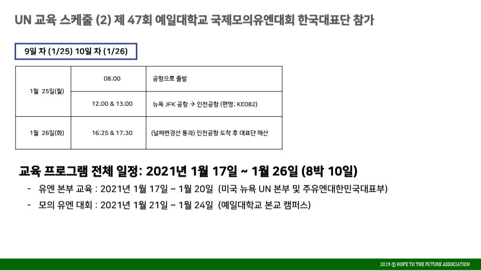 하단에 2021년 1월 예정인 UN전문가교육 및 예일대학교국제모의유엔대회 일정을 안내드리며,