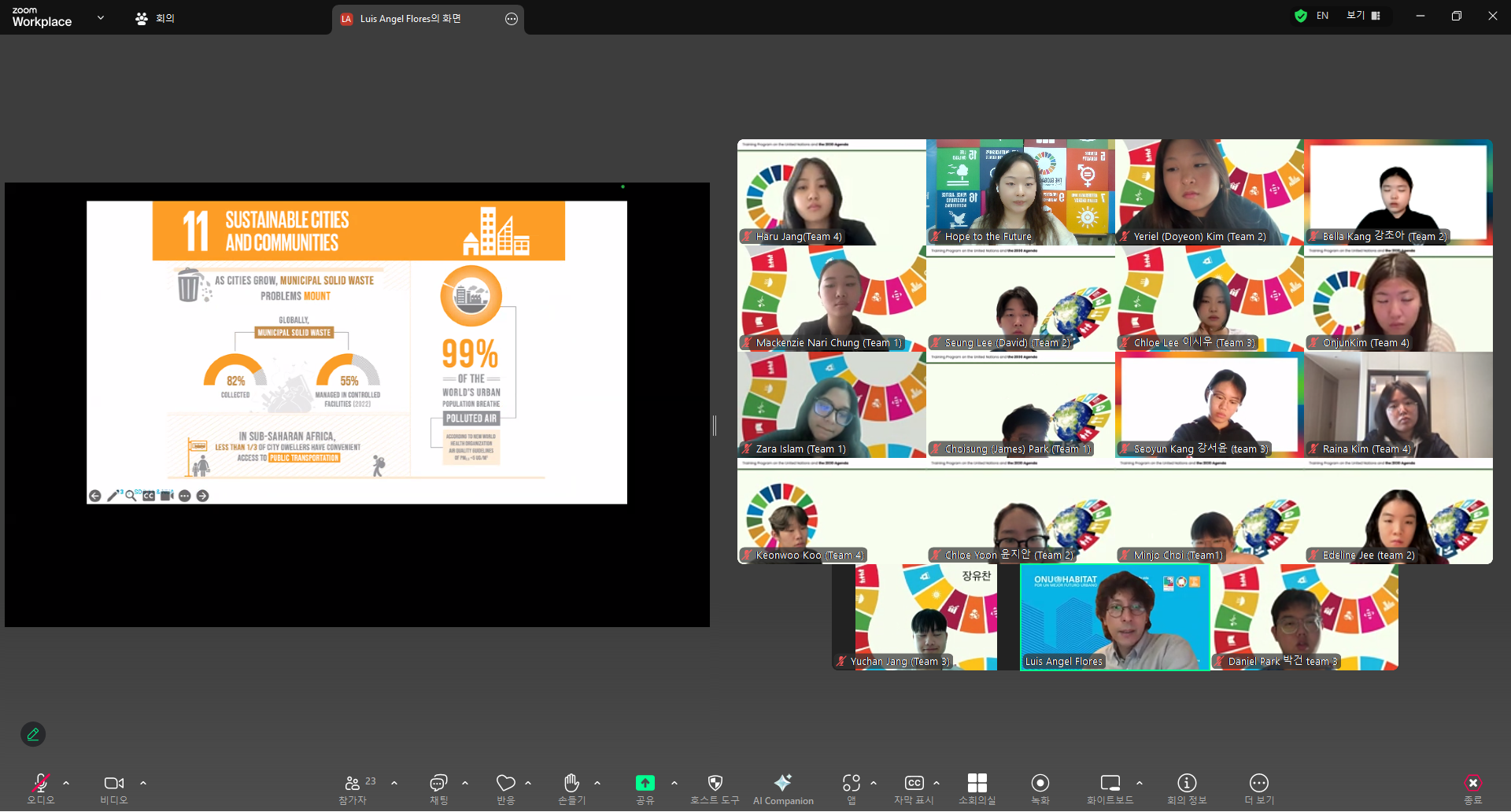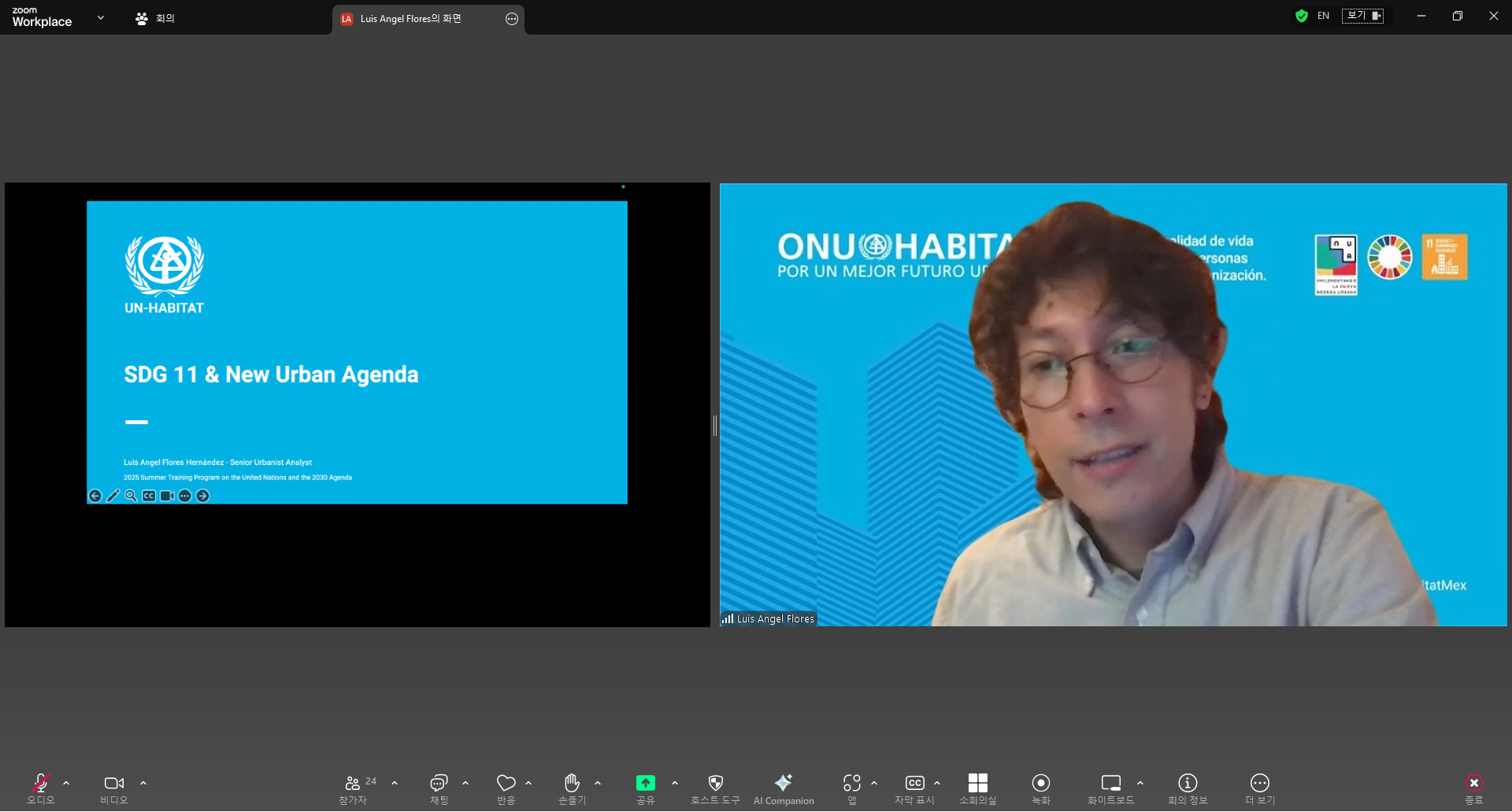 In the second session, Mr. Luis Angel Flores from UN-Habitat in Mexico City introduced the goals and implementation of SDG 11: Sustainable Cities and Communities. He emphasized the importance of bottom-up, community-led initiatives in urban planning and explained in detail how these were applied in real urban development projects in Mexico City. Students reflected on how similar strategies could be adapted to urban issues in Korea.