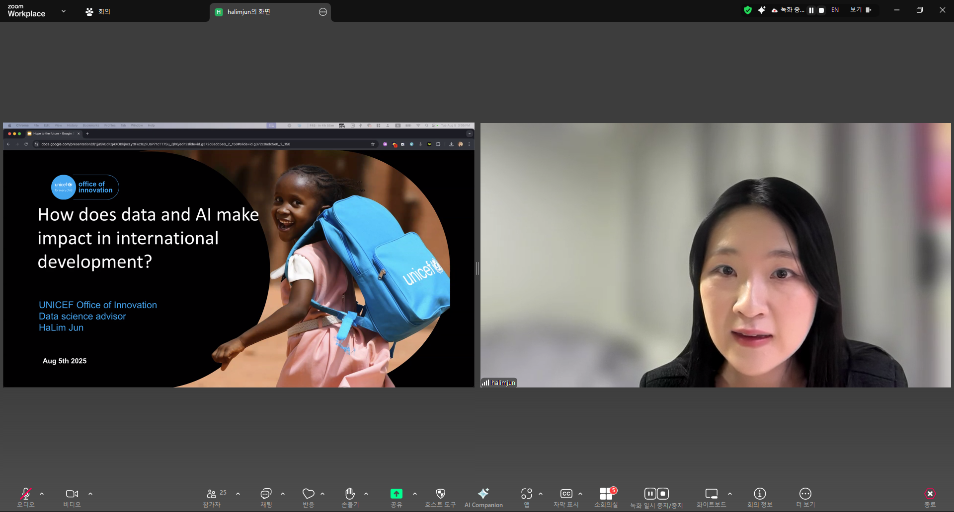 The third session was delivered by Ms. Halim Jun, a data scientist at the UNICEF Office of Innovation. She highlighted how data is collected, processed, and analyzed in international development settings, and explained how AI’s core functions?evidence-based decision-making, automation, and prediction?can contribute to sustainable development in the Global South.