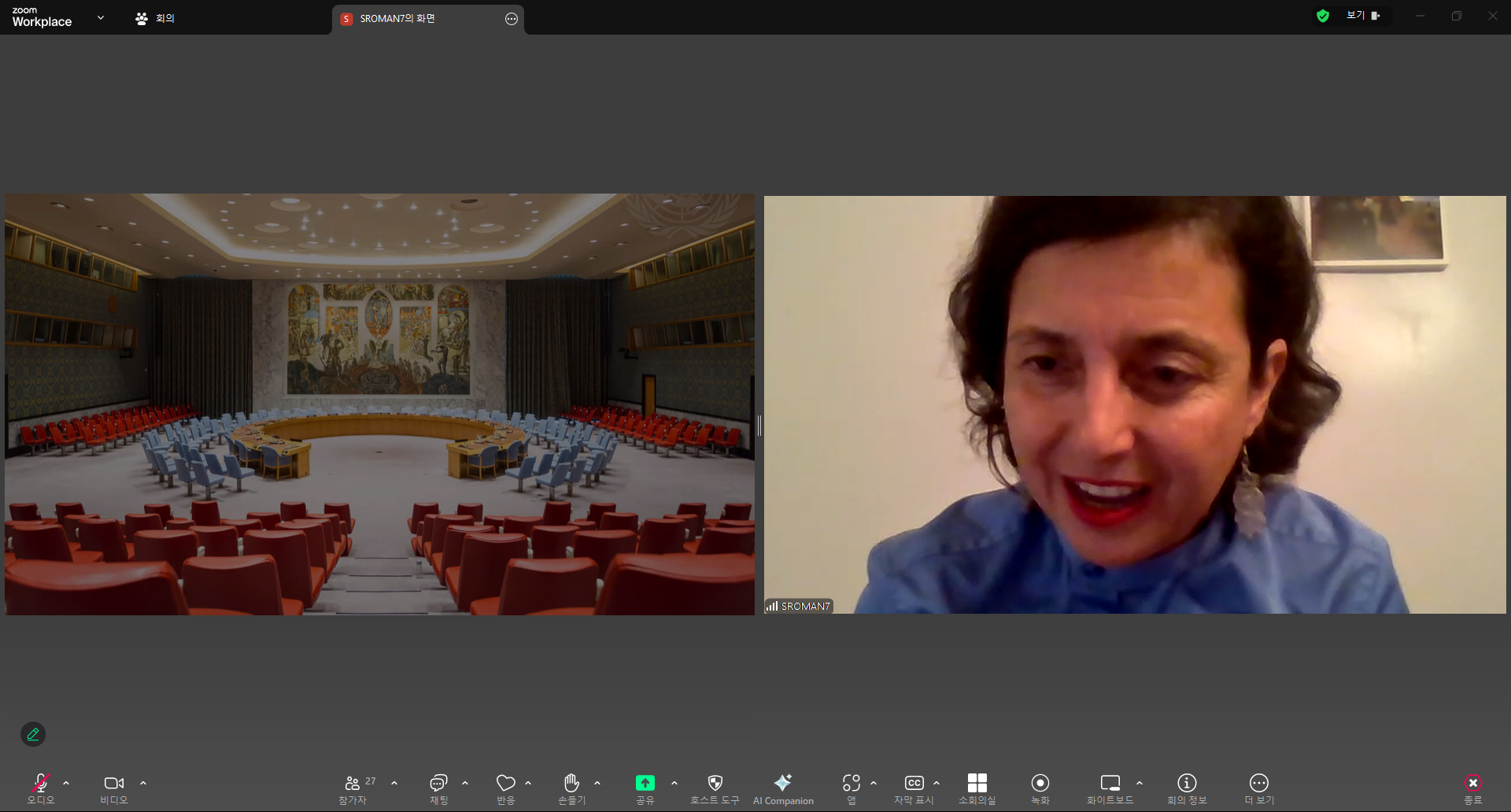 유엔 전문가 교육 첫날, 참가자들은 뉴욕 유엔 본부에서 투어를 담당하고 있는 Silmara Roman 연사님의 설명을 통해 유엔의 설립 배경과 역사, 그리고 국제사회에서 수행하는 핵심 역할에 대해 알아보았습니다. 이 시간을 통해 참가자들은 평화, 인권 등 인류 공동의 과제와, 유엔이라는 기구가 지닌 사명에 대해 다시금 생각해보는 계기를 가졌습니다.