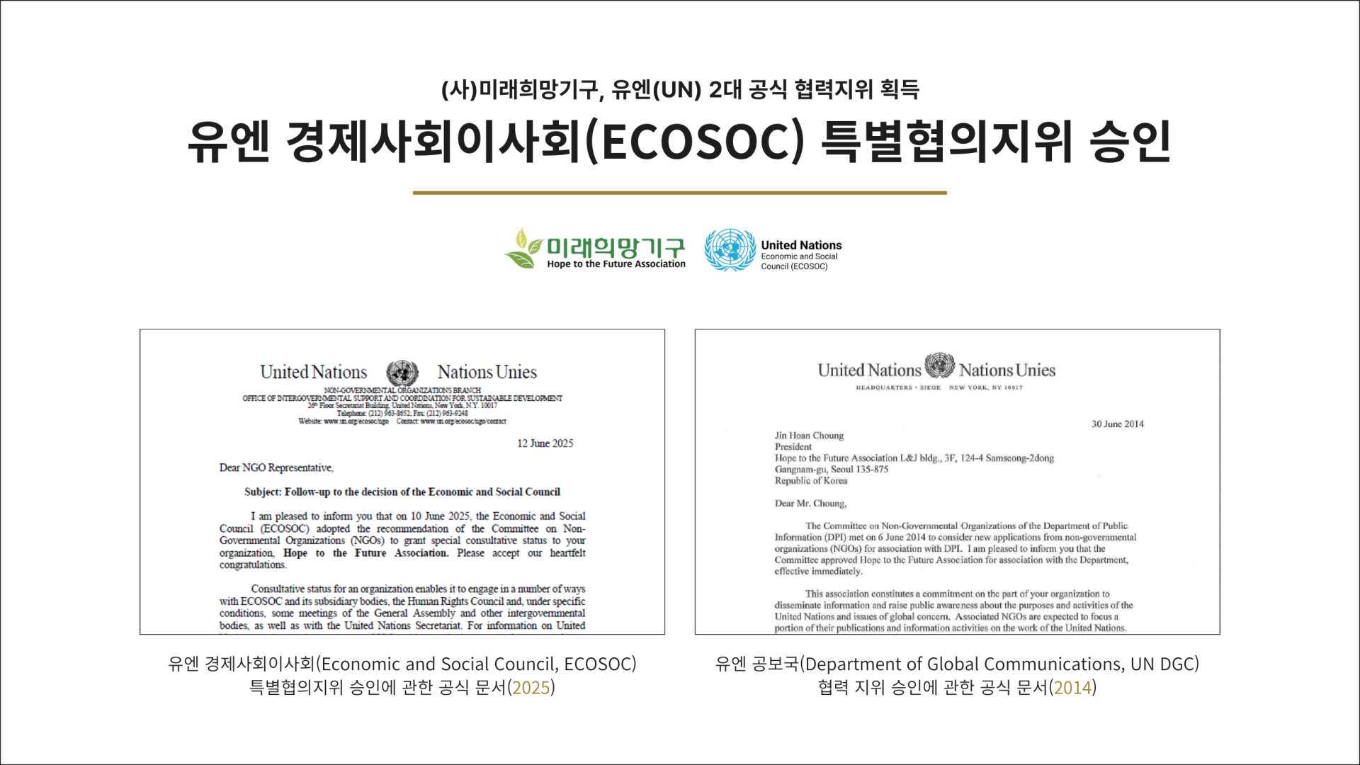 지난 6월, (사)미래희망기구는 유엔 경제사회이사회(United Nations Economic and Social Council, ECOSOC) 본회의를 통해 공식적으로 특별협의지위를 승인받았습니다.