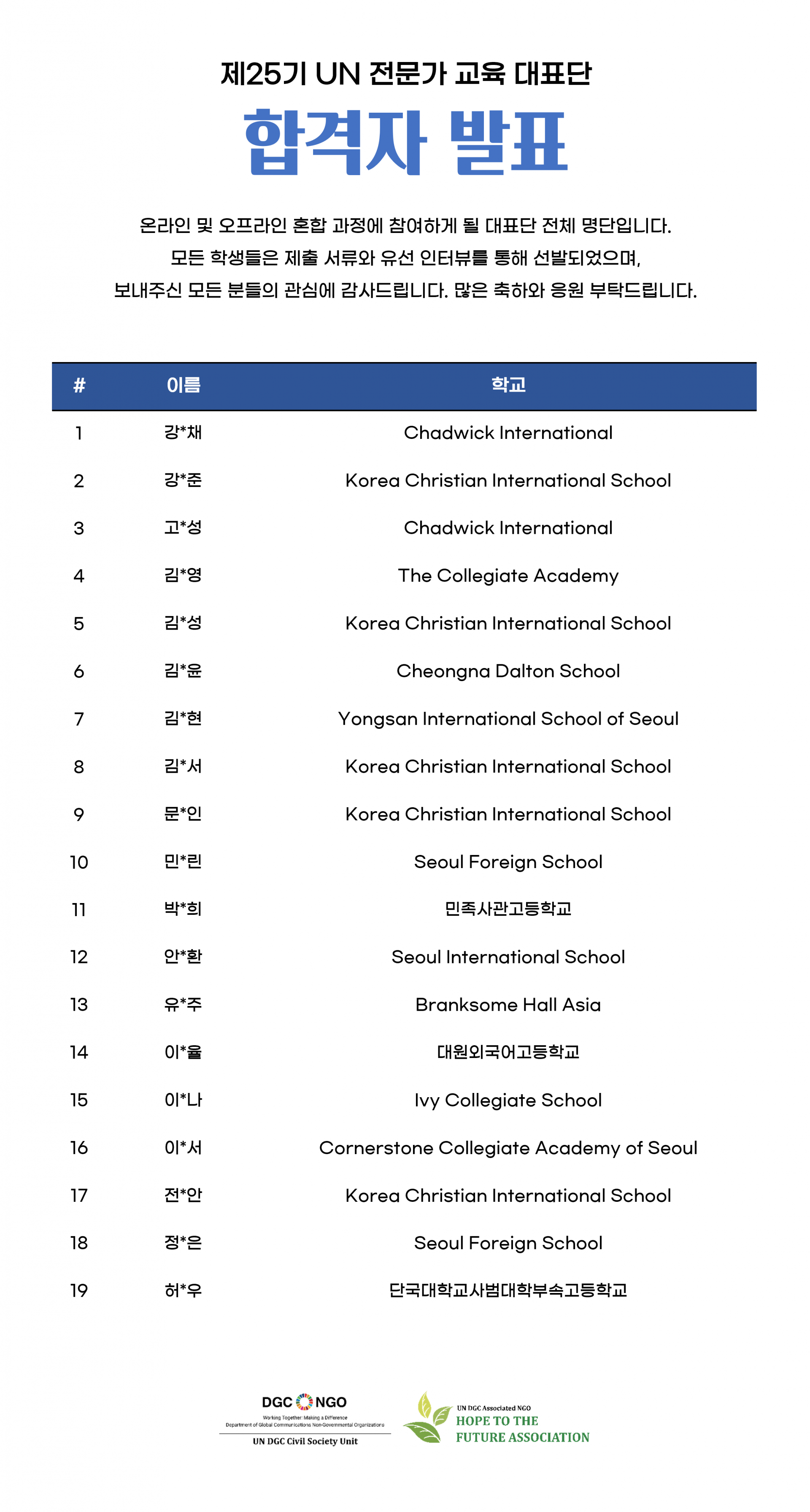 이번 겨울방학에는 미국 뉴욕, 스위스 제네바, 케냐 나이로비를 비롯한 국제사회 곳곳의 유엔(UN) 사무소 및 국제기구 현직자 및 지속가능발전목표(SDGs) 전문가를 초청하여 전 과정 온라인으로 진행될 예정입니다. 이를 위해 국내외에서 참여하는 학생들의 지원서를 모두 검토 후 유선 인터뷰를 통해 선발된 합격자 명단을 발표합니다. 아직 명단에 기재되지 않은 학생들도 면접 결과에 따라 순차적으로 합격 공고될 예정입니다.